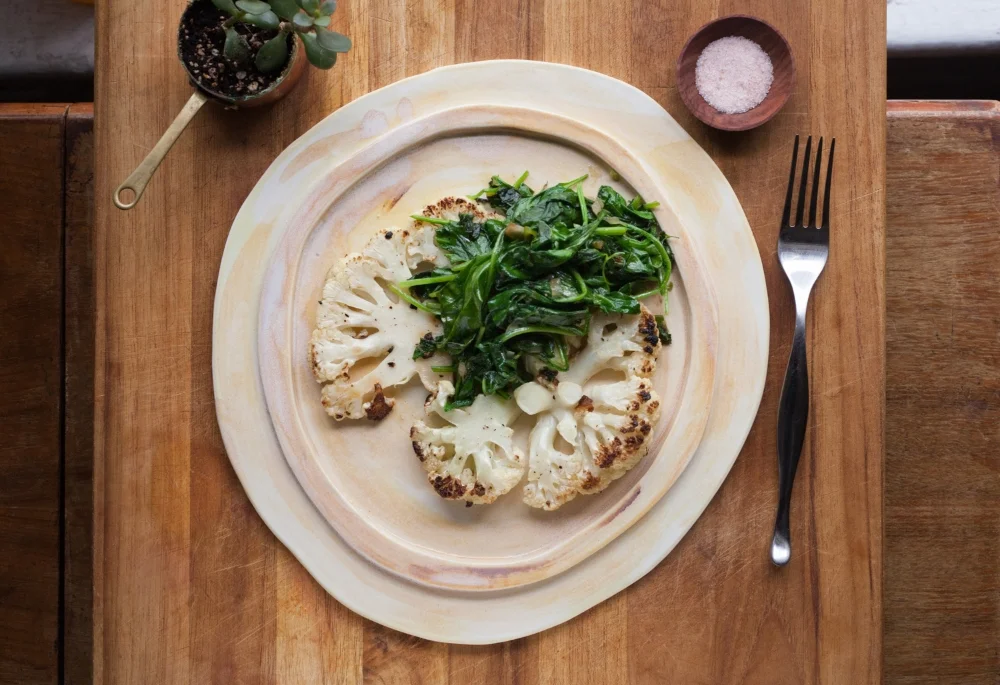 Cut 3 steaks from the cauliflower from the center of the head where the core is the thickest. Place cauliflower in a cast iron pan over medium heat with about 3 tablespoons of olive oil. Sprinkle some salt and pepper to your liking. Let it sear for about 5 minutes on each side then bring heat to high and give them a quick 2 minutes or cook until slightly browned.